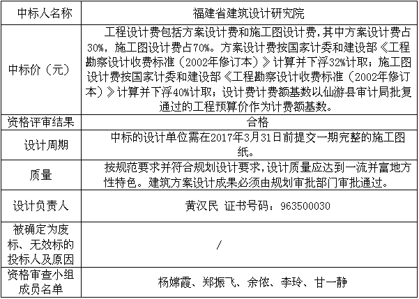 根據(jù)評審結(jié)果確定福建省建筑設(shè)計研究院為中標(biāo)人, 現(xiàn)在在仙游縣建工投資集團有限公司公告欄和仙游縣建工投資集團有限公司網(wǎng)站上公示。公示期自2017年 2月 4日至2017年 2 月 10日。投標(biāo)人對中標(biāo)結(jié)果有異議或認(rèn)為評標(biāo)活動存在違法違規(guī)行為,可在公示期內(nèi)向有關(guān)部門投訴。